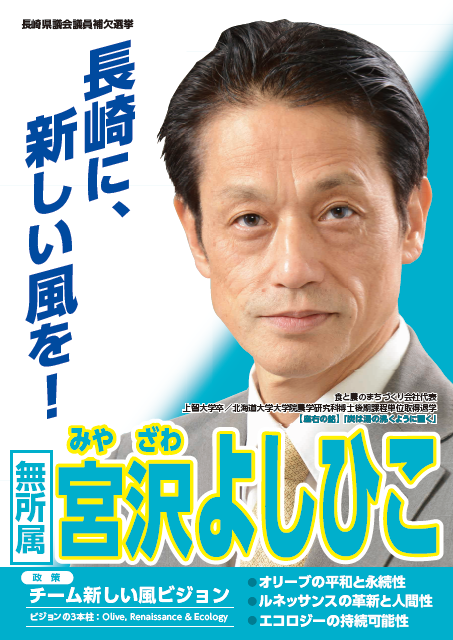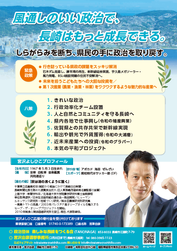 2022年長崎県知事選挙に石木ダム計画の見直しを求め立候補。目指したのは長崎県の貴重な自然環境と歴史ある地域社会と命が大切にされ誰ひとり取り残されずイノベーションで展望が広がり自由で開かれた気風が尊ばれ政治が信じられるものになる「ワクワクする長崎」選挙には敗れましたが引き続きあきらめない人たちを応援していきます。